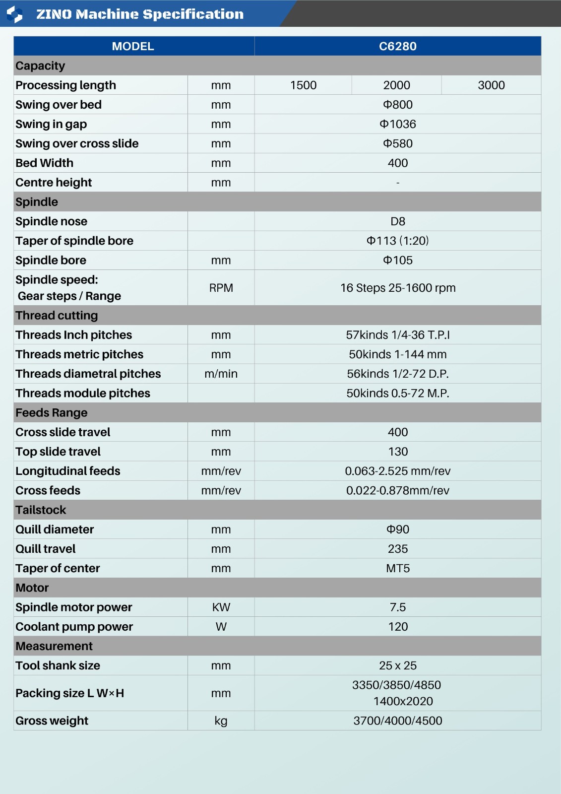 1. Swing over bed -800mm2. Length -1500/2000/3000mm3. Spindle bore -Φ105mm4. Spindle Motor -7.5kw5. Spindle speed -16 steps/25--1600rpm6. Manual Chuck -Φ315mm